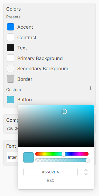 - Colors: Choose from preset colors for key elements such as Accent, Contrast, Text, Primary Background, Secondary Background, and Border, or define and save a Custom color by clicking the plus (+) icon. For details on how to add a custom color, check the Adding Custom Colors section.
