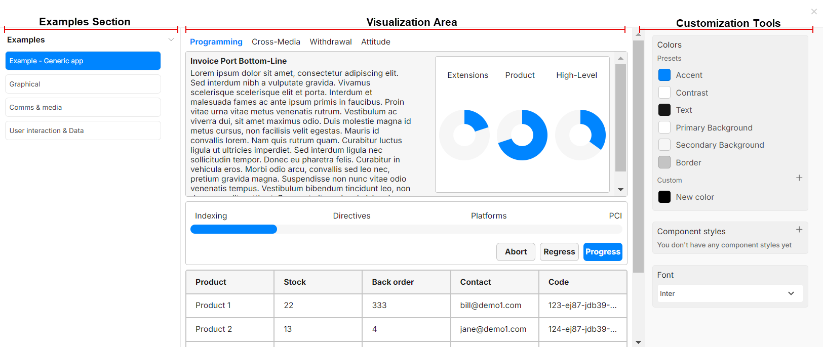 The left-hand Examples panel offers a set of component examples. These examples give App Builders a quick visual reference of how various components and styling options will look after the customization. The available categories include: