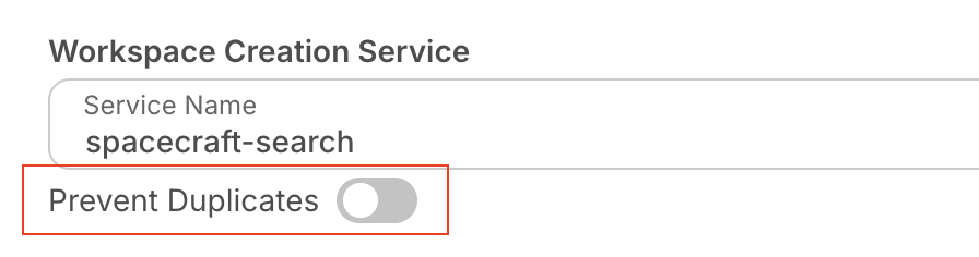 You may want to prevent the creation of duplicate workspaces when the Workspace Creation Service URL is used multiple times with the same parameters. In the same configuration panel, you can enable the Prevent Duplicates toggle.