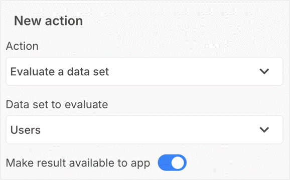 When you use the Evaluate a data set step in an action sequence, you can choose whether the result is sent to the App for use elsewhere or kept within the Action Sequence. This behavior is managed through the Make result available to app toggle.