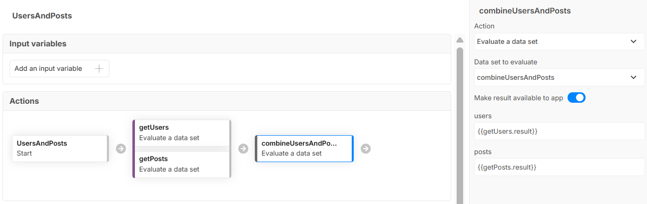 - The combineUsersAndPosts step has Make result available to app set to On, which means its combined result is made available to the App and can be referenced anywhere.
